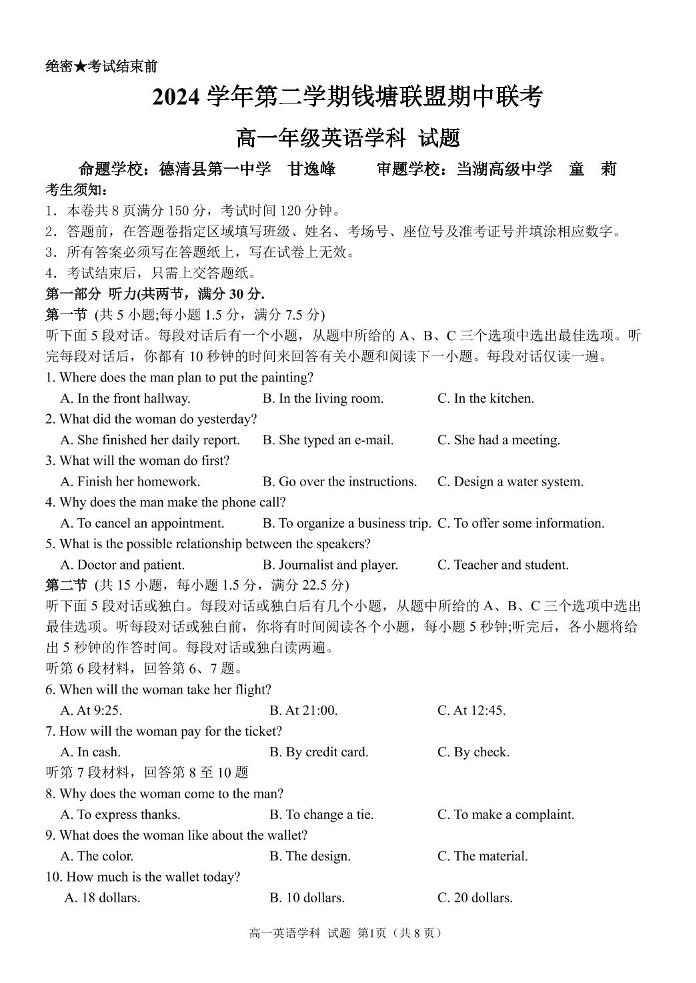 浙江省钱塘联盟2024-2025学年下学期高一期中联考英语+答案