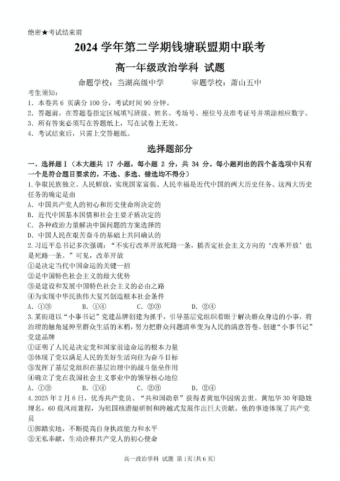 浙江省钱塘联盟2024-2025学年下学期高一期中联考政治+答案