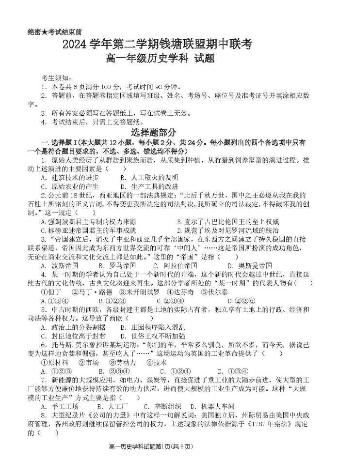 浙江省钱塘联盟2024-2025学年下学期高一期中联考历史+答案