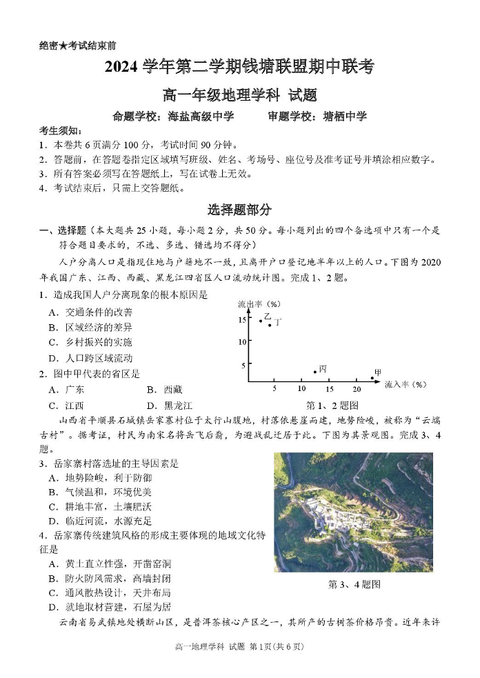 浙江省钱塘联盟2024-2025学年下学期高一期中联考地理+答案