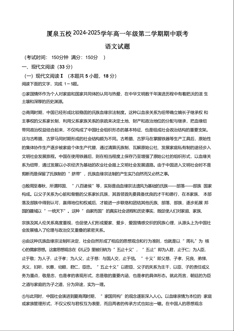 福建省厦泉五校2024-2025学年下学期高一期中考试语文+答案
