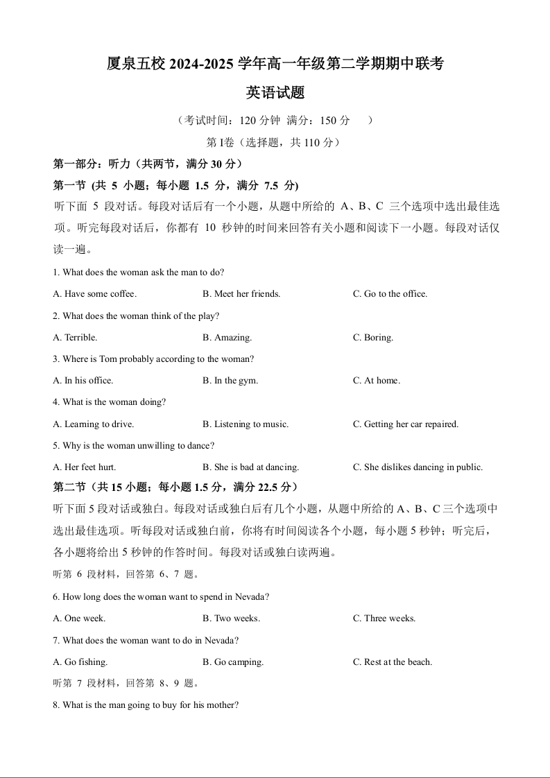 福建省厦泉五校2024-2025学年下学期高一期中考试英语+答案