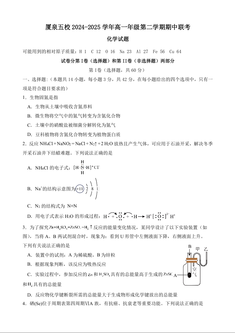 福建省厦泉五校2024-2025学年下学期高一期中考试化学