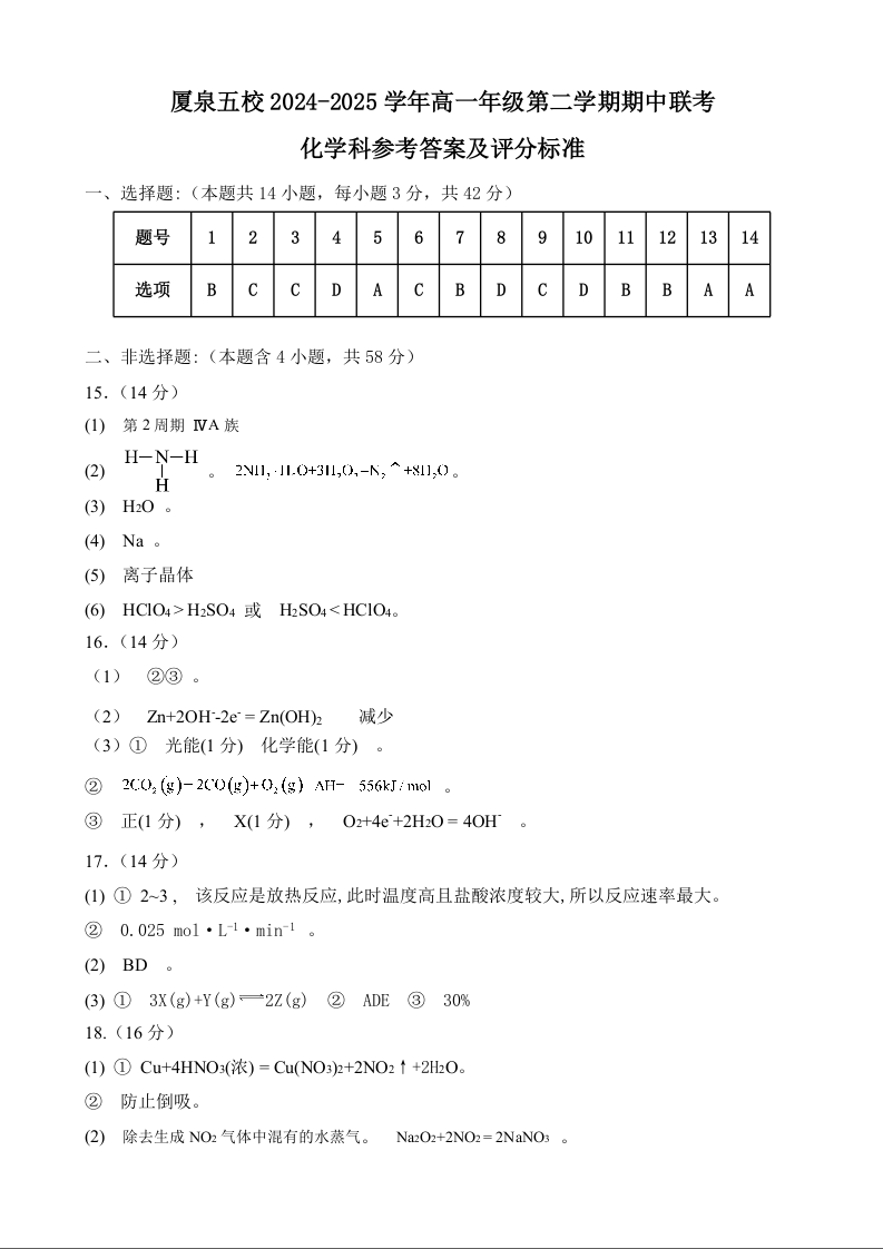 福建省厦泉五校2024-2025学年下学期高一期中考试化学答案