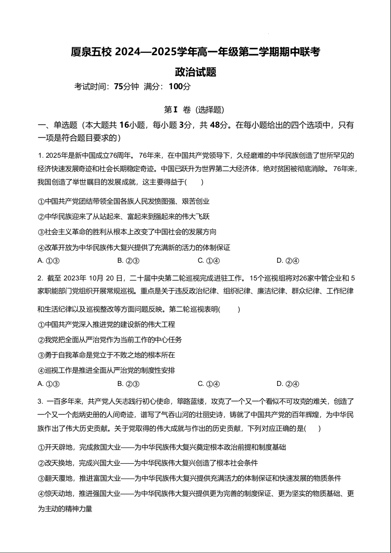福建省厦泉五校2024-2025学年下学期高一期中考试政治+答案
