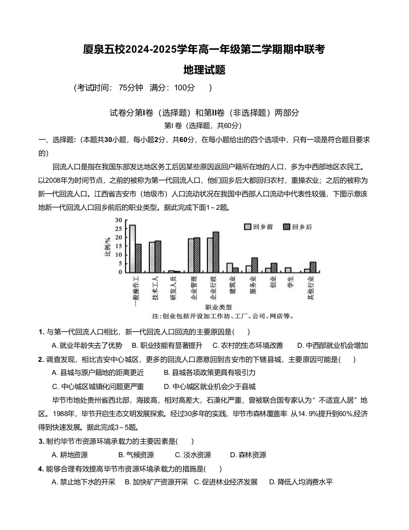 福建省厦泉五校2024-2025学年下学期高一期中考试地理+答案