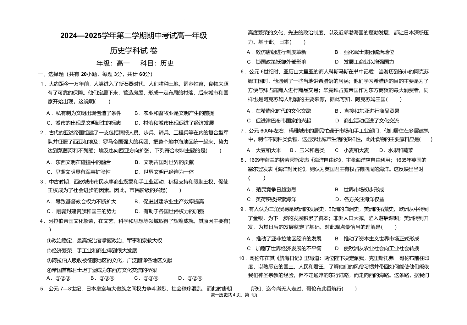 甘肃省兰州市第四片区2024-2025学年下学期高一期中考试历史+答案
