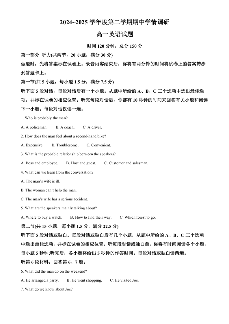 江苏省徐州市铜山区2024-2025学年下学期高一期中考试英语