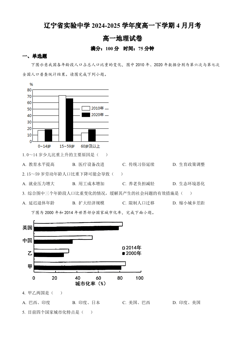 辽宁省实验中学2024-2025学年下学期高一阶段测试地理+答案