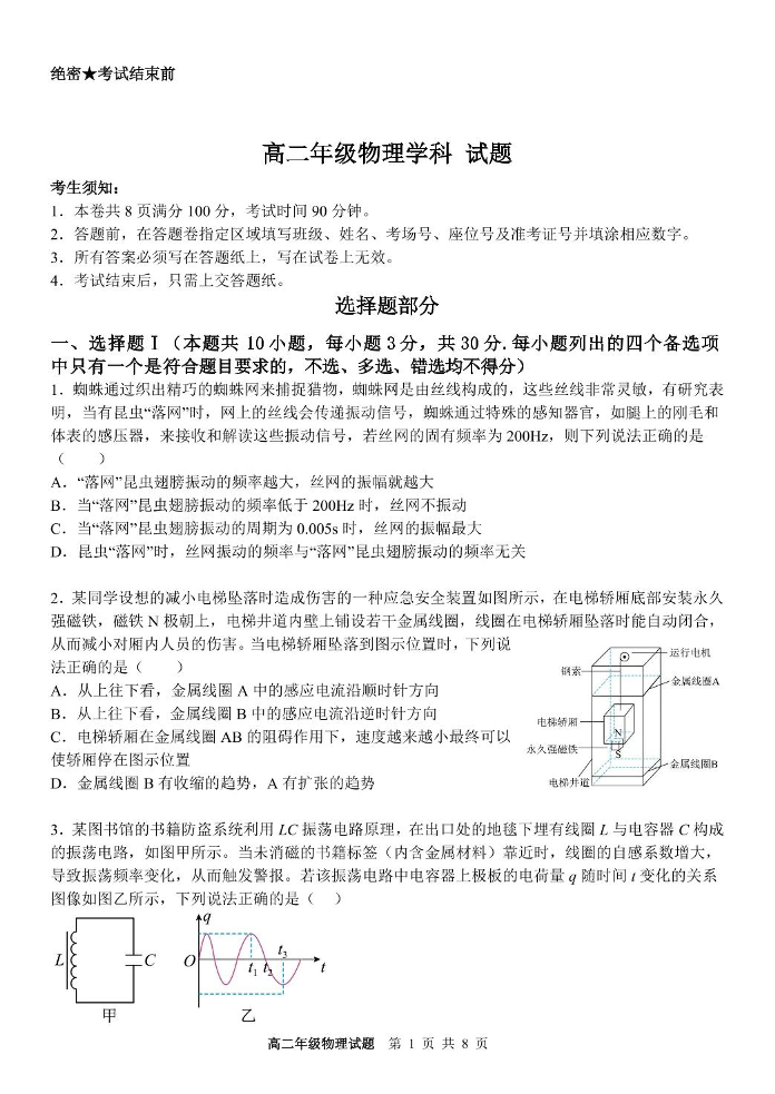 浙江省宁波市六校联盟2024-2025学年下学期高二期中联考物理+答案