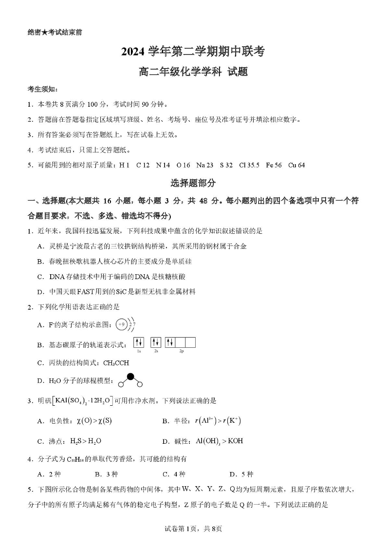 浙江省宁波市六校联盟2024-2025学年下学期高二期中联考化学+答案