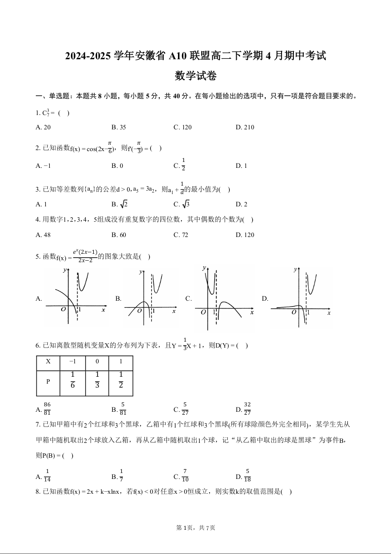 安徽省A10联盟2024-2025学年下学期高二期中考试数学+答案