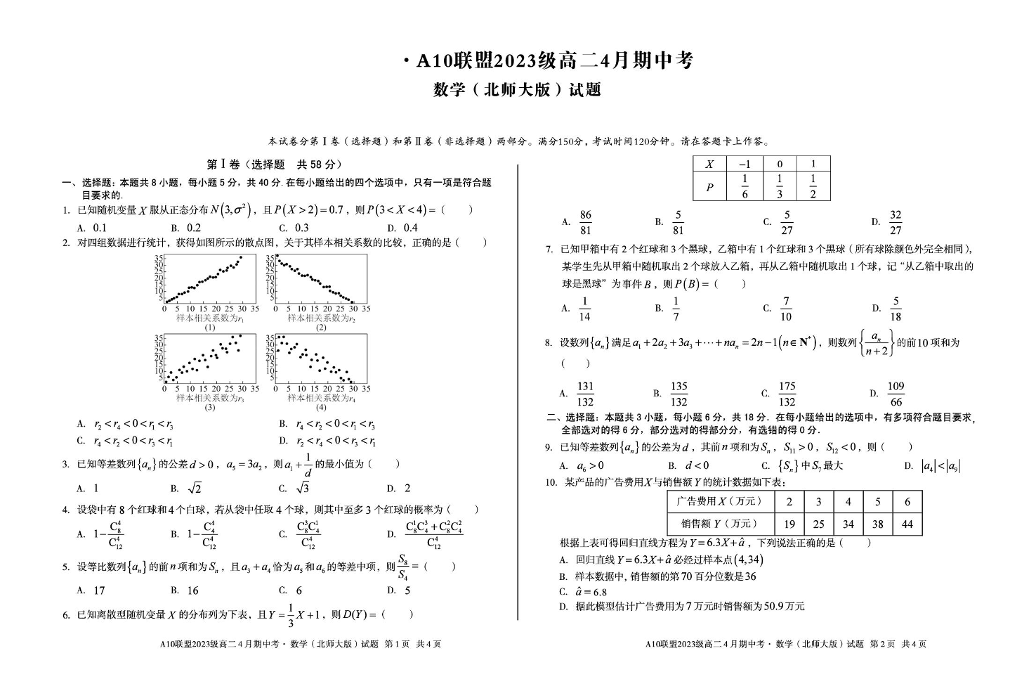 安徽省A10联盟2024-2025学年下学期高二期中考试数学(北师大版)+答案
