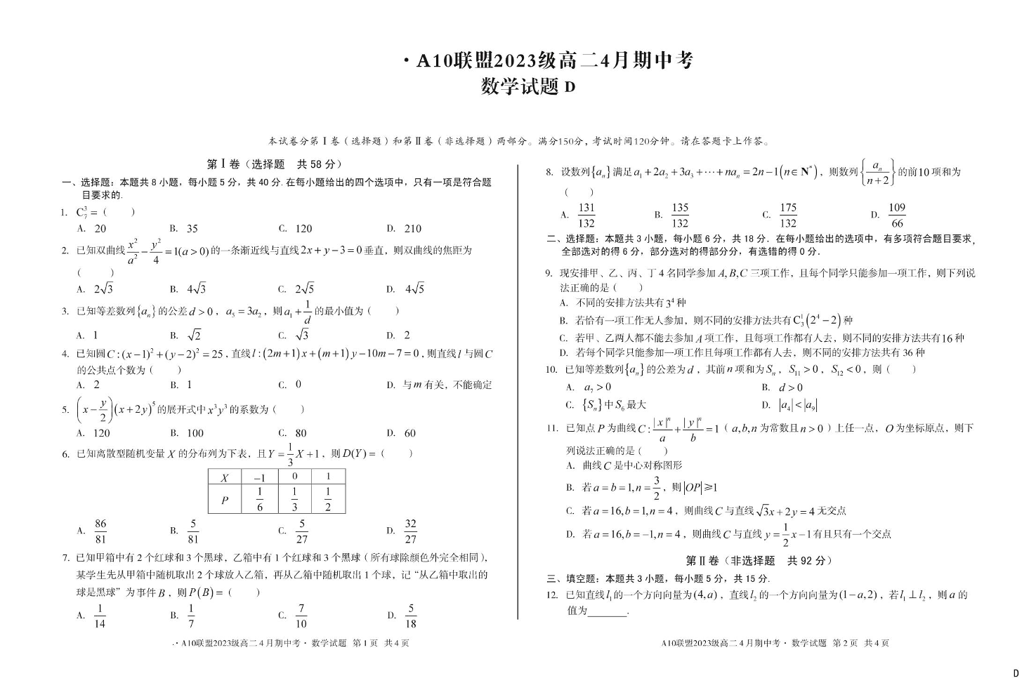 安徽省A10联盟2024-2025学年下学期高二期中考试数学(D卷)+答案