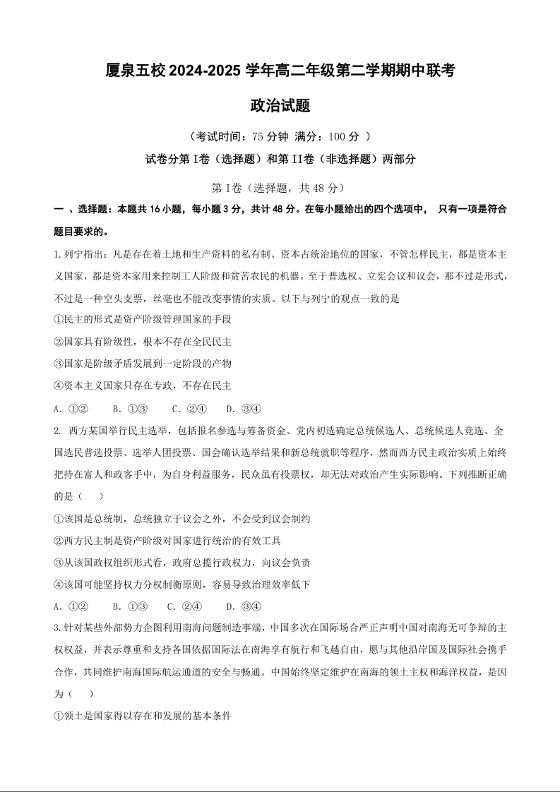 福建省厦泉五校2024-2025学年下学期高二期中联考政治+答案