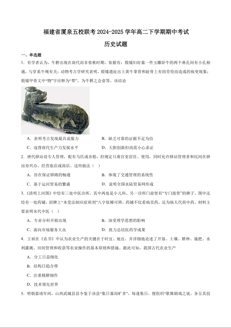 福建省厦泉五校2024-2025学年下学期高二期中联考历史+答案