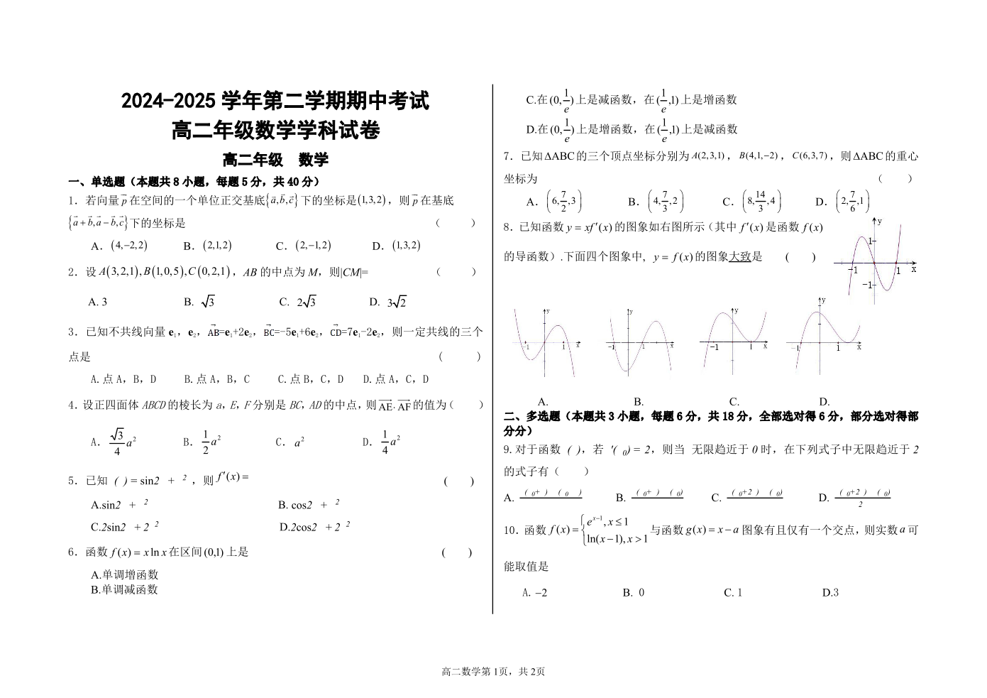 甘肃省兰州市第四片区2024-2025学年下学高二期期中考试数学+答案