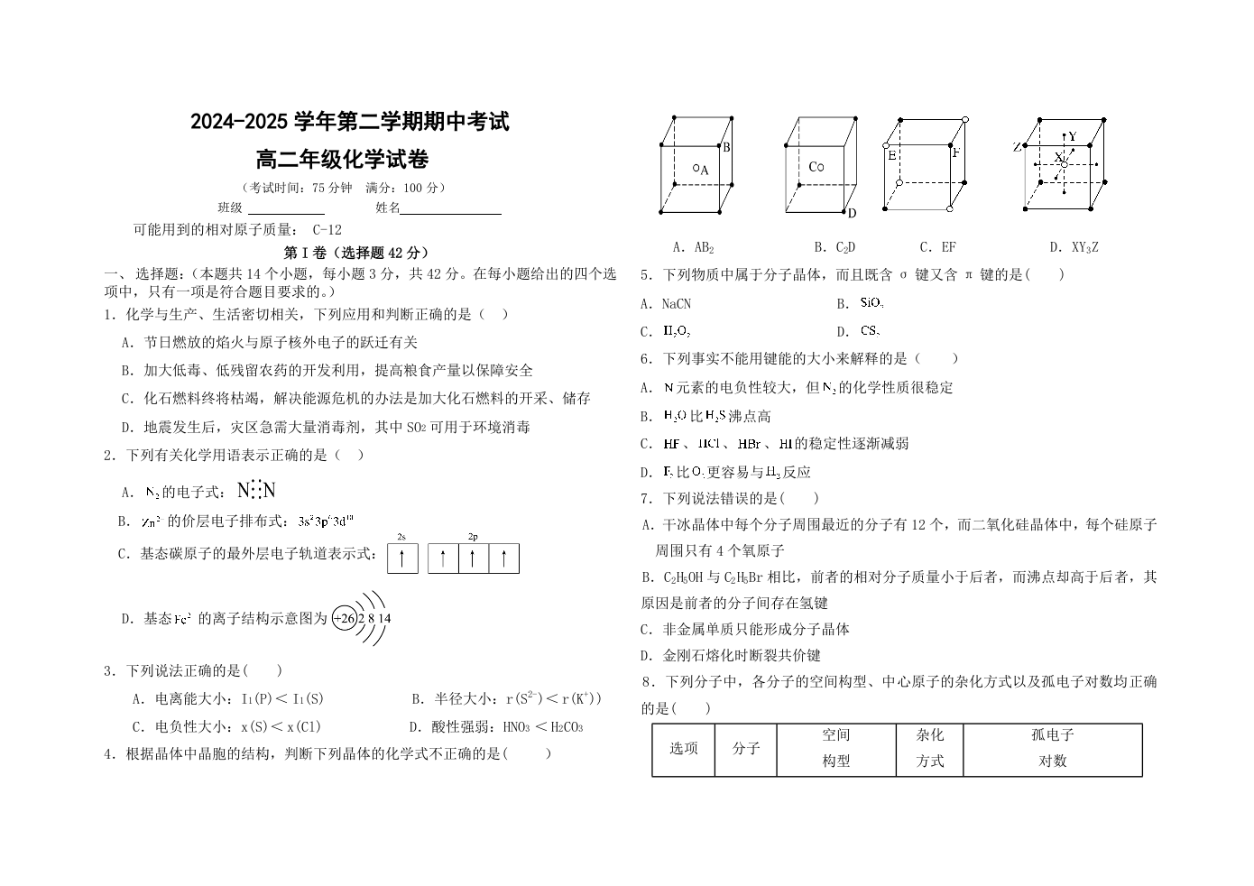 甘肃省兰州市第四片区2024-2025学年下学高二期期中考试化学