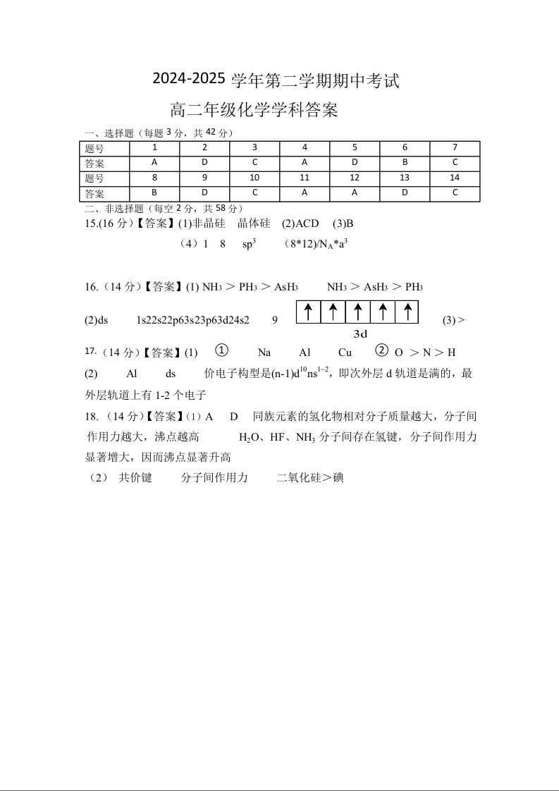 甘肃省兰州市第四片区2024-2025学年下学高二期期中考试化学答案