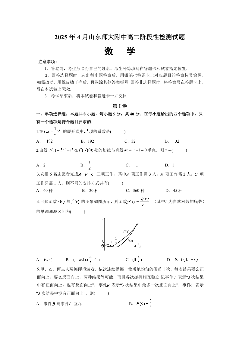 山东省师大附中2024-2025学年下学期高二期中考试数学+答案