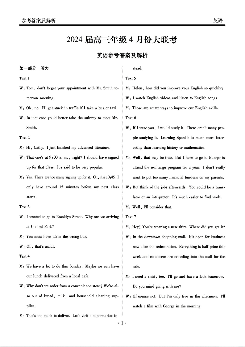 衡水金卷2024届高三4月大联考(新教材)英语答案