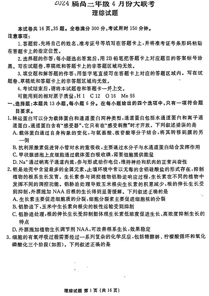 衡水金卷2024届高三4月大联考(新教材)理综