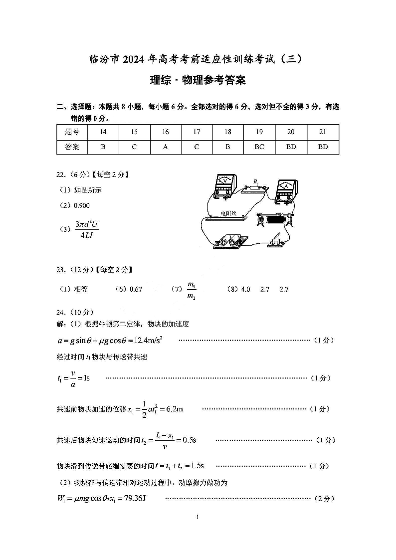 山西省临汾市2024届高三下学期考前适应性训练(三)(临汾三模)理综答案