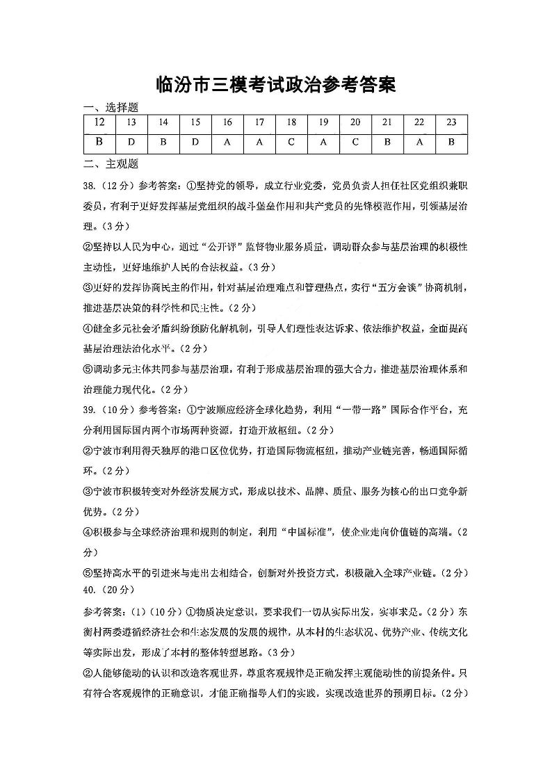 山西省临汾市2024届高三下学期考前适应性训练(三)(临汾三模)文综答案