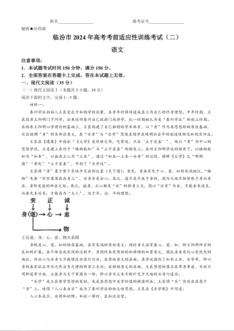 山西省临汾市2024届高三下学期考前适应性训练考试(临汾二模)语文