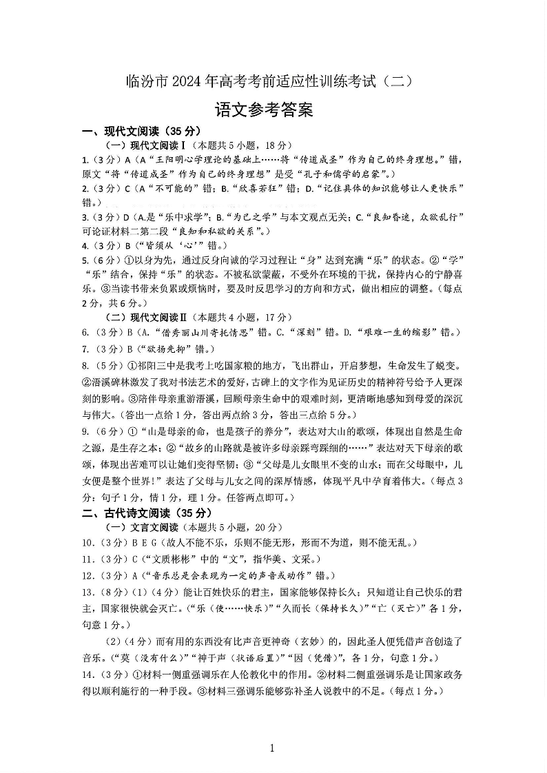 山西省临汾市2024届高三下学期考前适应性训练考试(临汾二模)语文答案