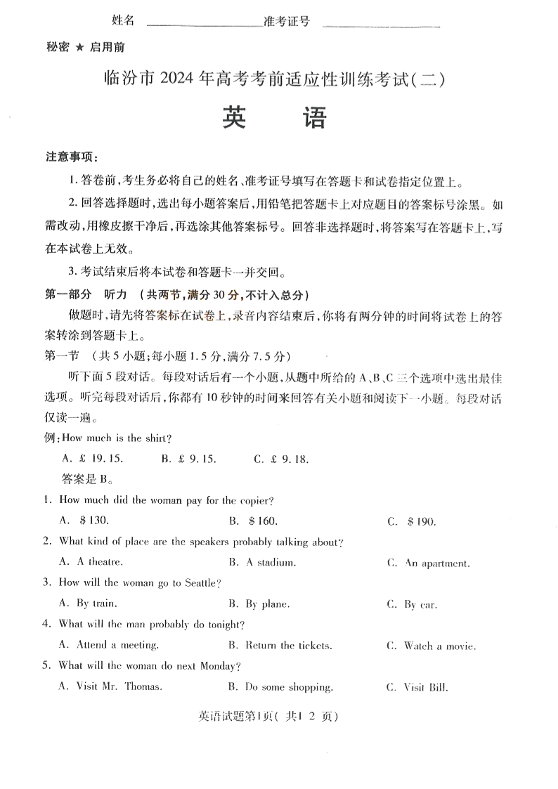山西省临汾市2024届高三下学期考前适应性训练考试(临汾二模)英语