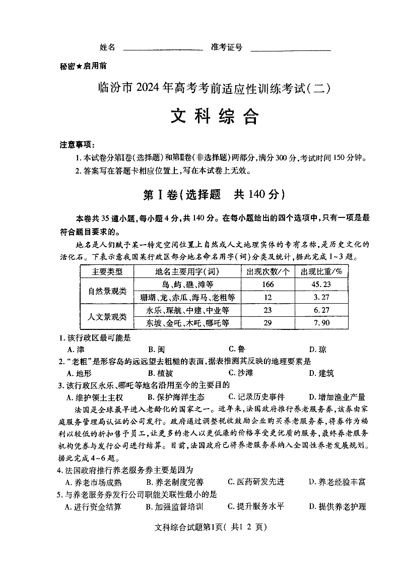 山西省临汾市2024届高三下学期考前适应性训练考试(临汾二模)文综