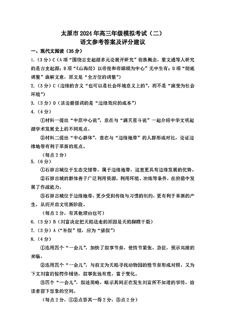 山西省太原市2024年高三年级模拟考试(二)(太原二模)语文答案