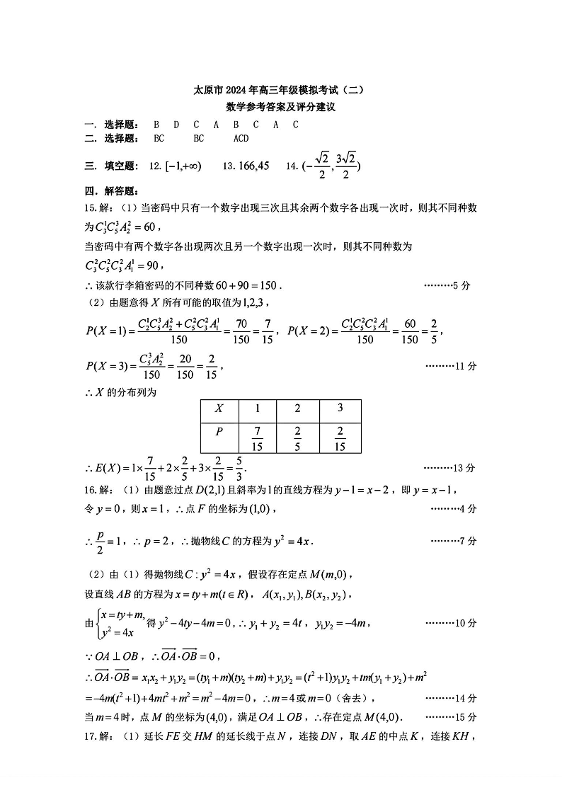 山西省太原市2024年高三年级模拟考试(二)(太原二模)数学答案