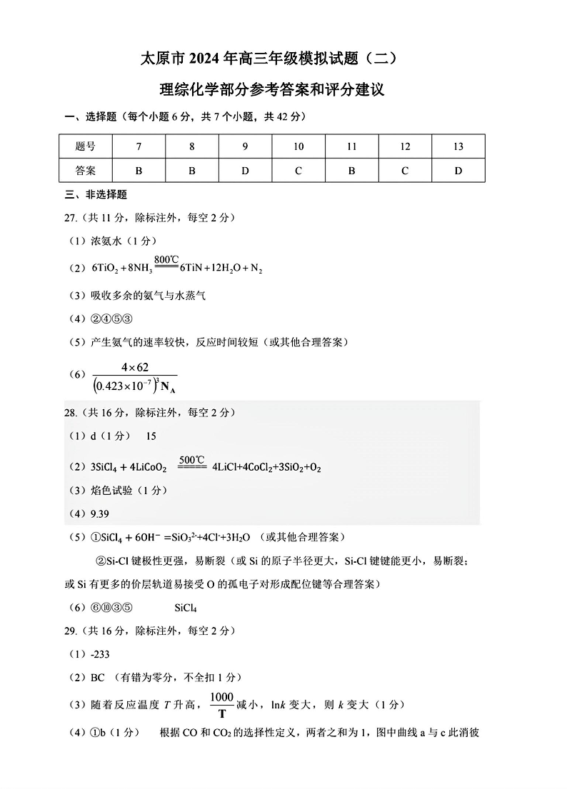 山西省太原市2024年高三年级模拟考试(二)(太原二模)化学答案