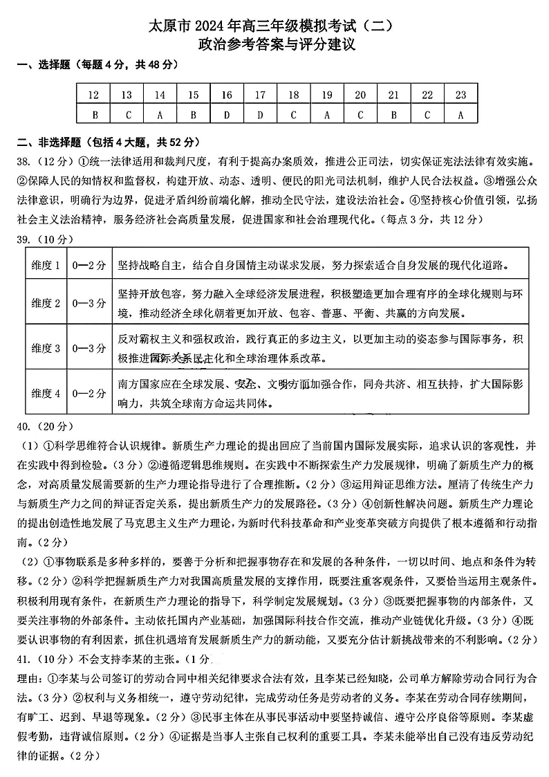 山西省太原市2024年高三年级模拟考试(二)(太原二模)政治答案