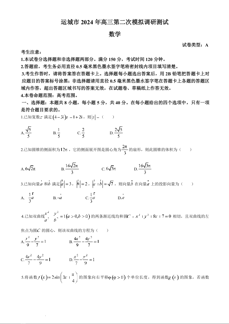 山西省运城市2024届高三第二次模拟调研测试(运城二模)数学+答案