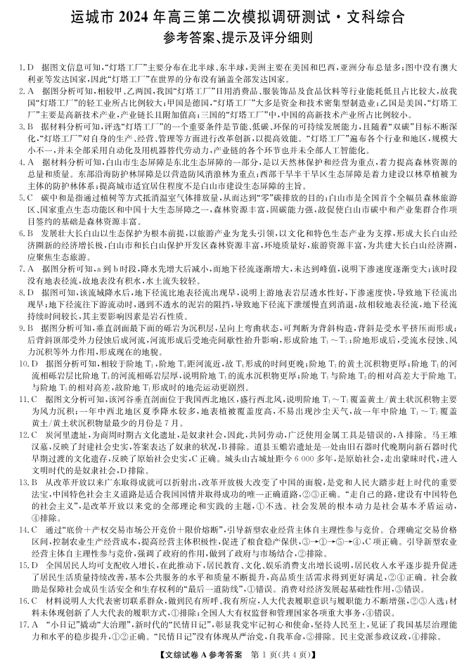 山西省运城市2024届高三第二次模拟调研测试(运城二模)文综答案