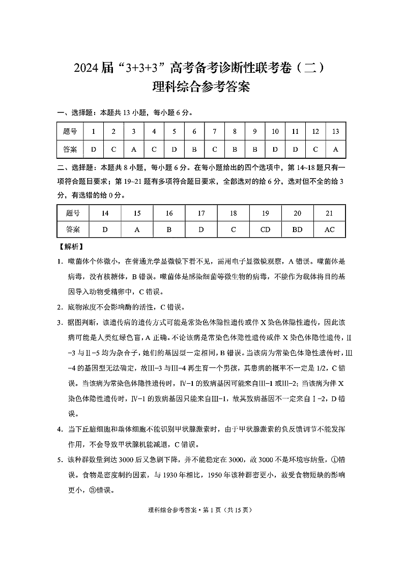 云南省2024届“3+3+3”高考备考诊断性联考卷(二)理综答案