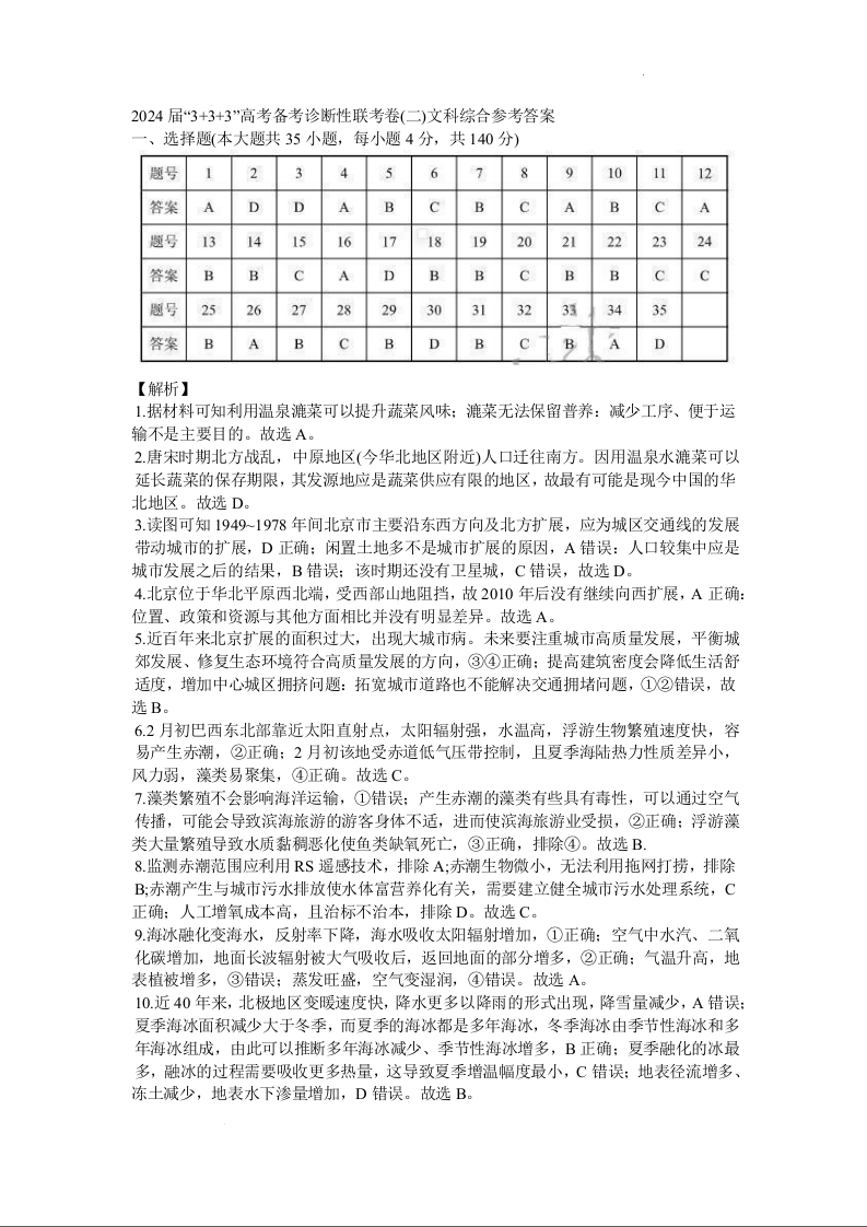 云南省2024届“3+3+3”高考备考诊断性联考卷(二)文综答案