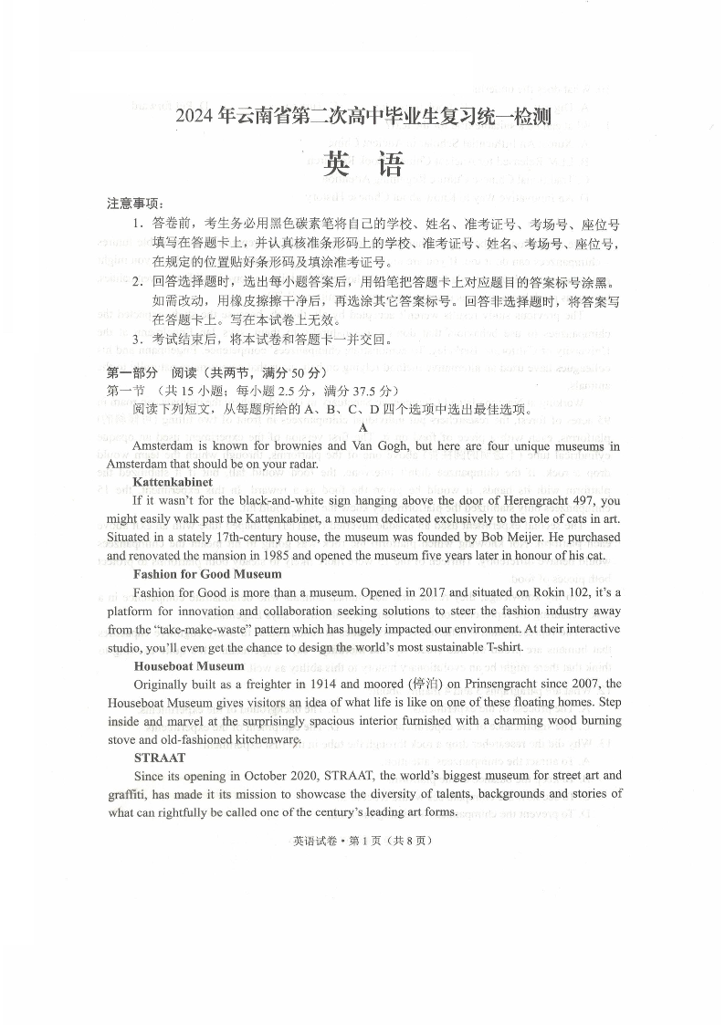 云南省2024届高三下学期第二次高中毕业生复习统一检测(云南二统)英语