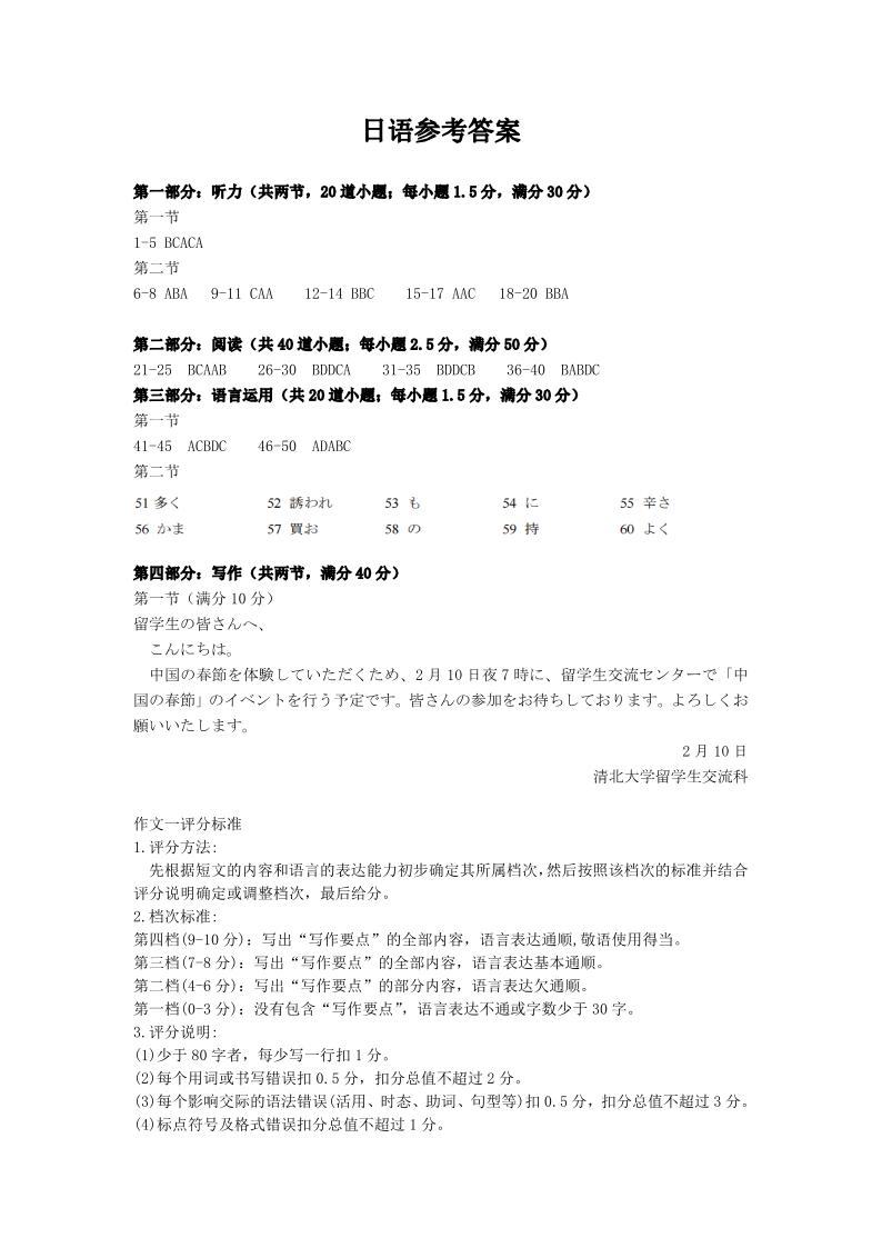 云南省2024届高三下学期第二次高中毕业生复习统一检测(云南二统)日语答案