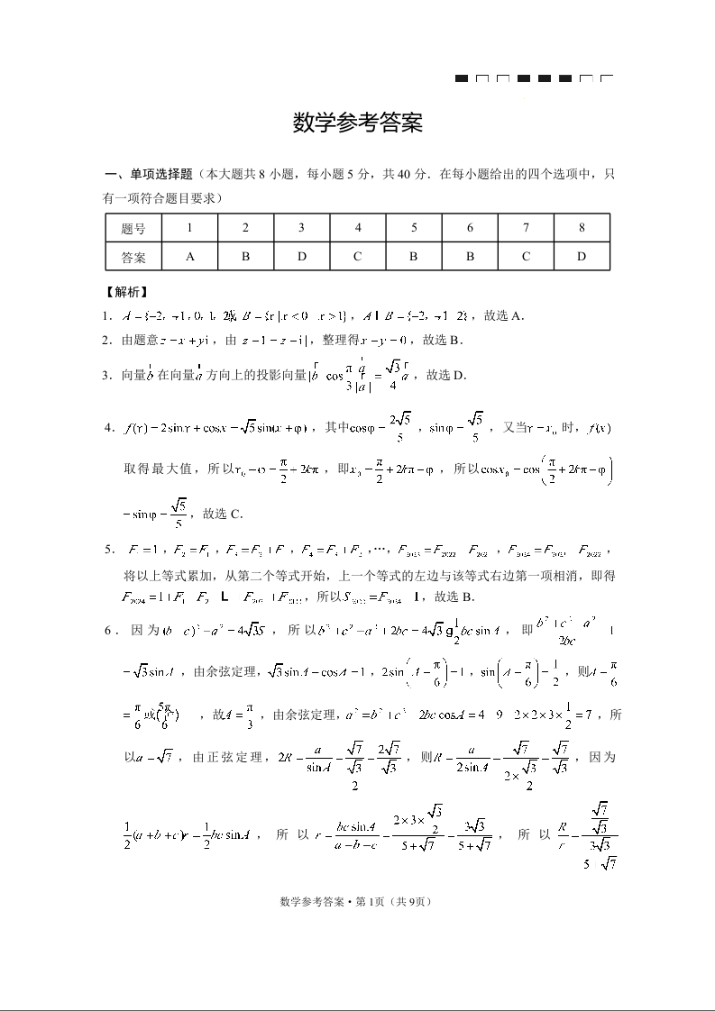 云南师范大学附属中学2024届高三下学期高考适应性月考卷(九)数学答案