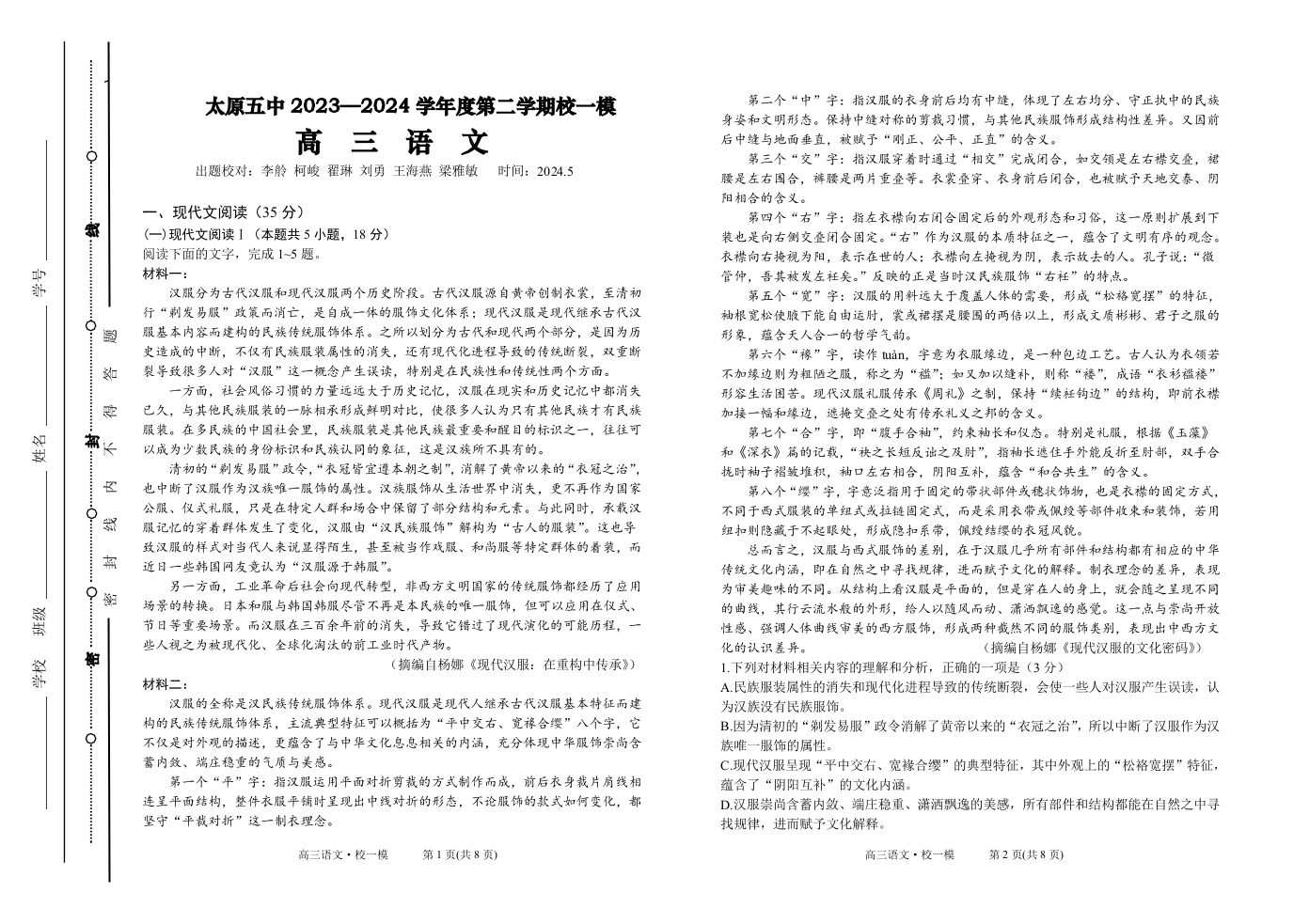 山西省太原市第五中学2024届高三下学期一模语文