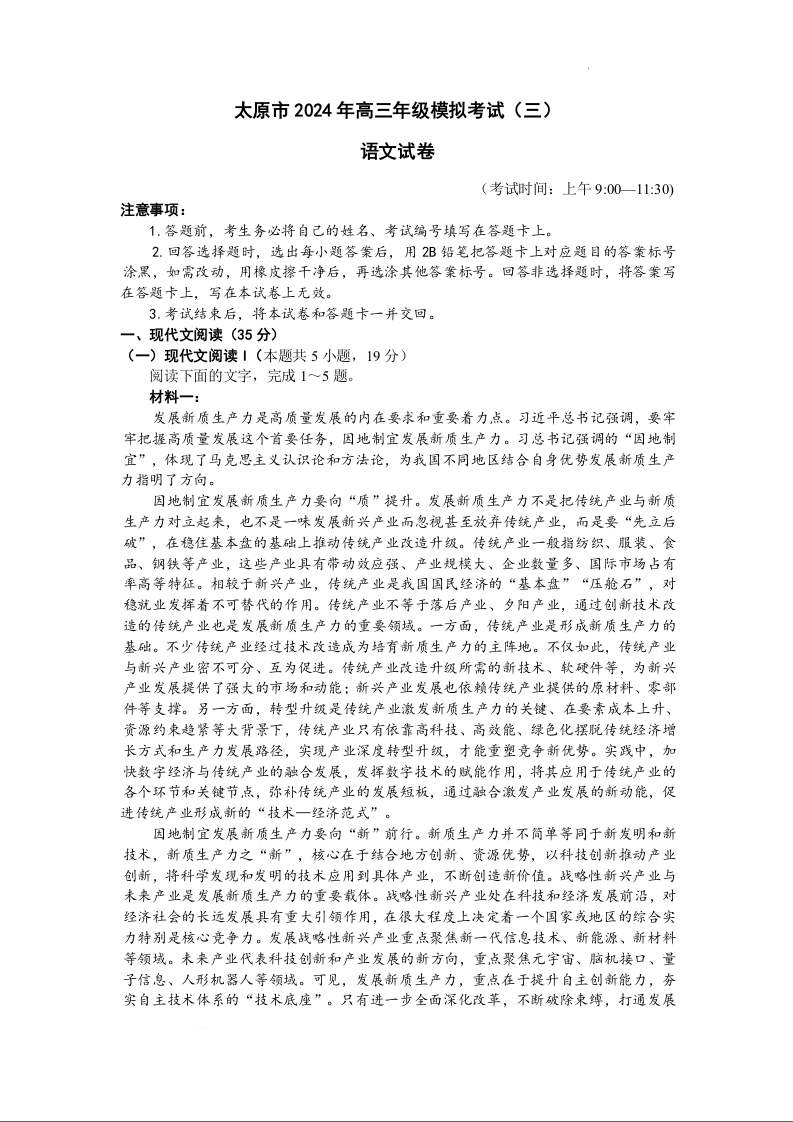 山西省太原市2024届高三下学期三模考试(太原三模)语文+答案