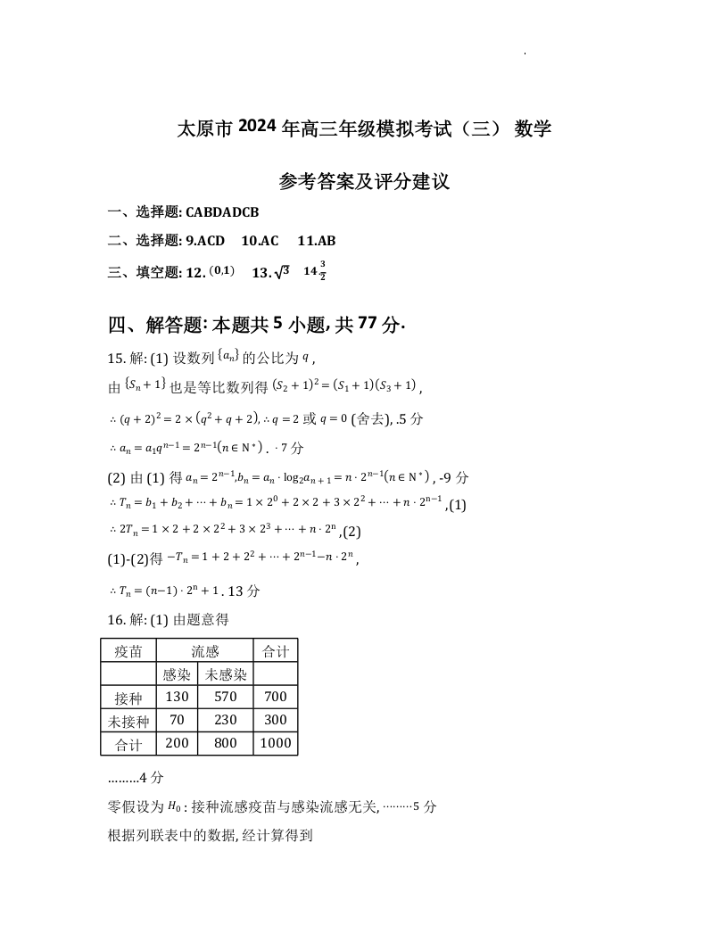 山西省太原市2024届高三下学期三模考试(太原三模)数学答案