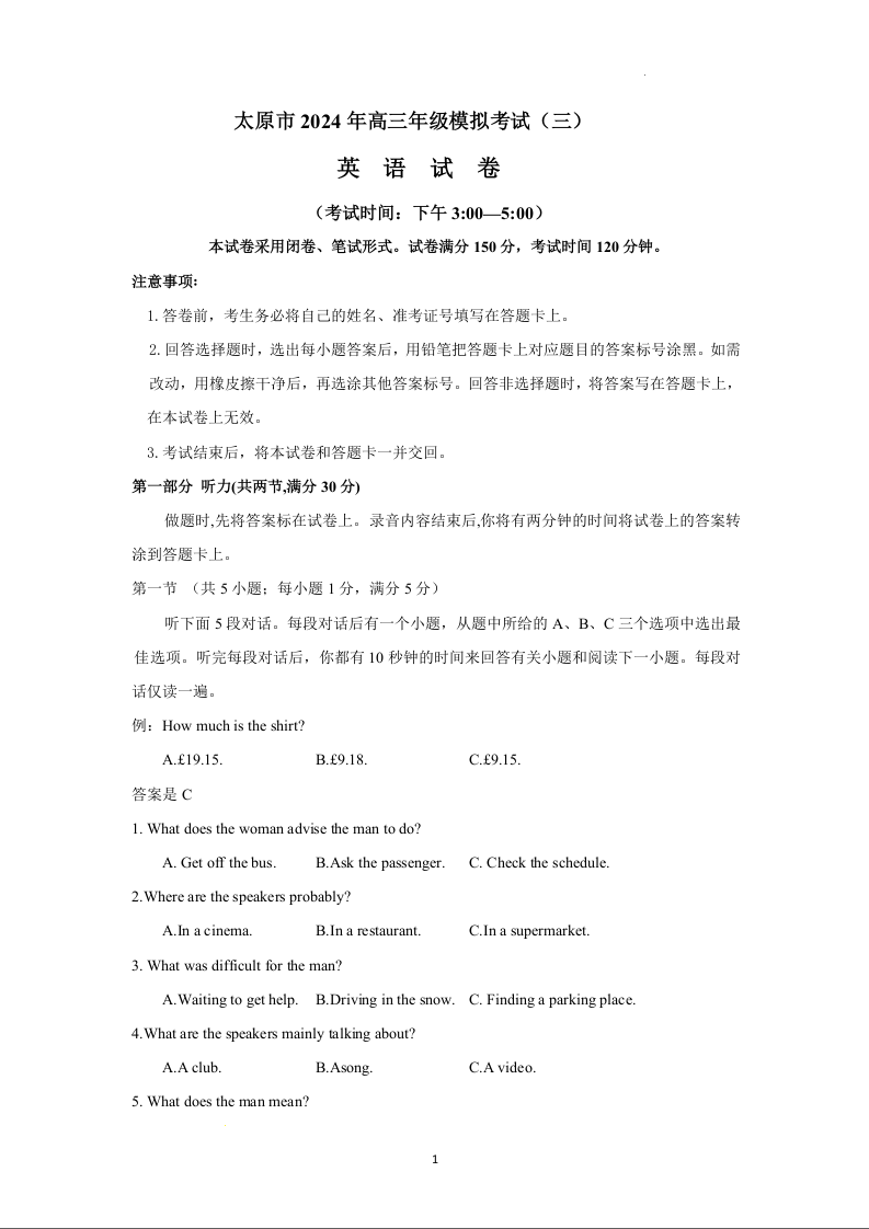 山西省太原市2024届高三下学期三模考试(太原三模)英语