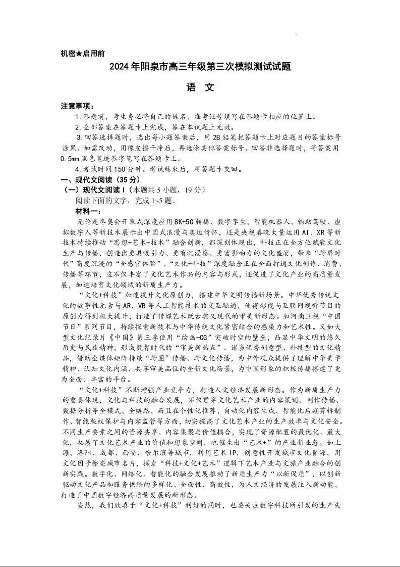 山西省阳泉市2024届高三下学期第三次模拟测试语文+答案