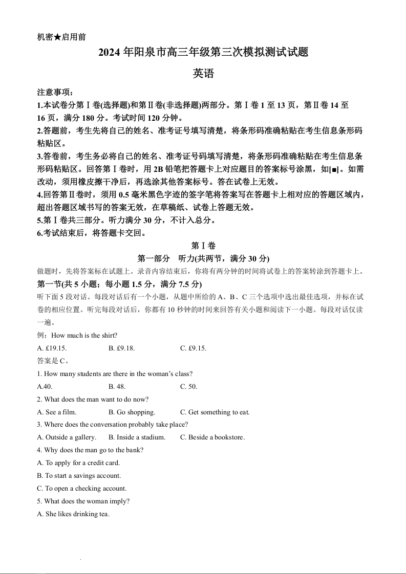 山西省阳泉市2024届高三下学期第三次模拟测试英语+答案