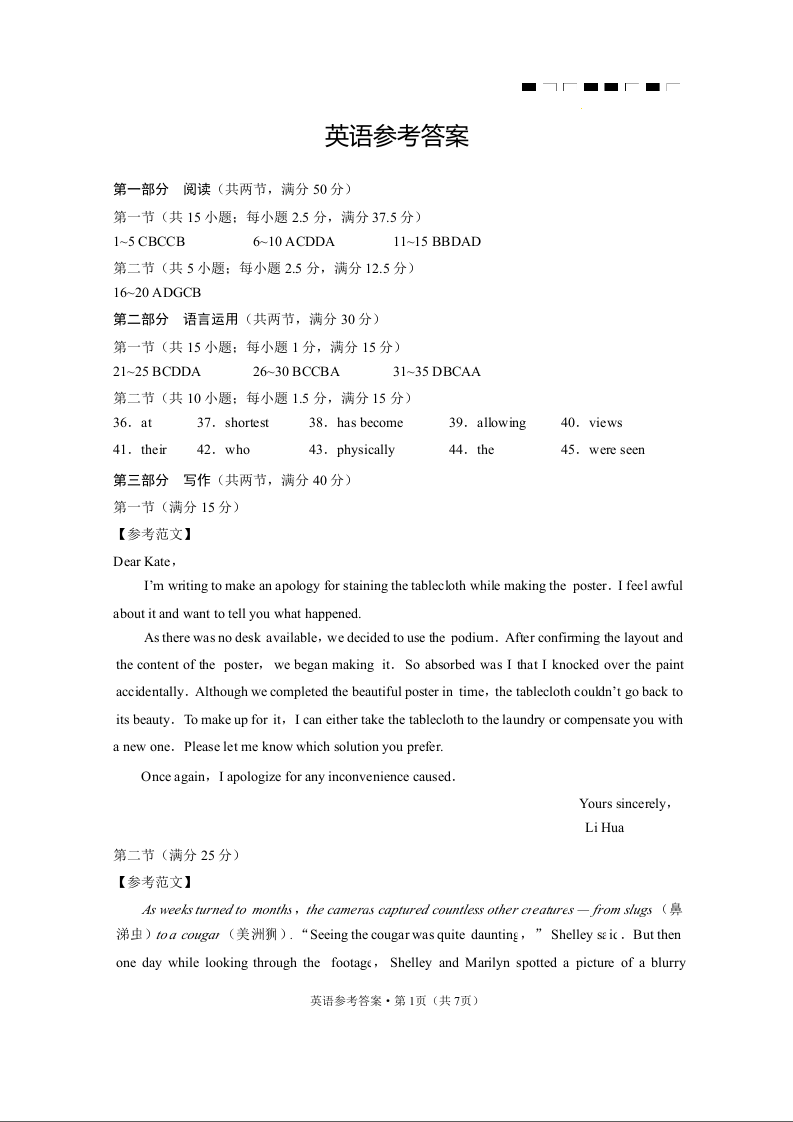 云南师范大学附属中学2024届高考适应性月考卷(十)英语答案